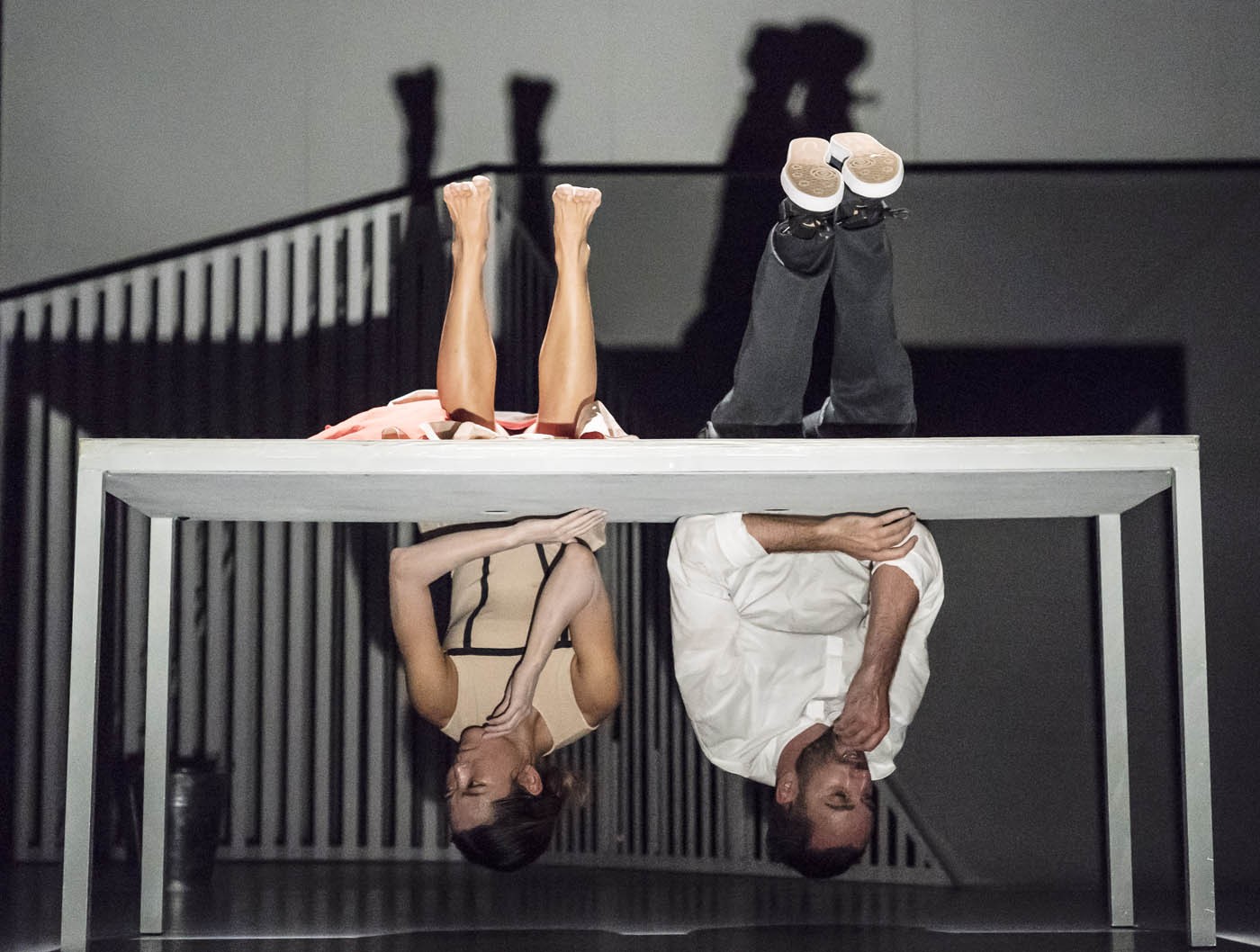 He is playful, striding heel-first in trainers, and super-light on his feet, seeming to hang in the air at an impossible angle. Wang, meanwhile, is low-centred with legs in a deep plié, powerful and ready to pounce. She hits her martial arts-inspired shapes at rapid-fire speed, with precise head movements and fluttering fingers that combine grace and energy. Shizuka Hariu's set and the technical effects are top-notch The show seamlessly follows all 15 tracks on the album, and in this minimalist yet mobile setting, the protagonists — who could be humans or spirits — go through a series of encounters, orchestrated and watched over by the singer. There is a Pandora’s box — containing we know not what — passed between them like a symbol of the future. They scrabble up the slope, hang under a table, creep up the stairs and take to the air in delightful flying sequences that place the movement in multiple planes.